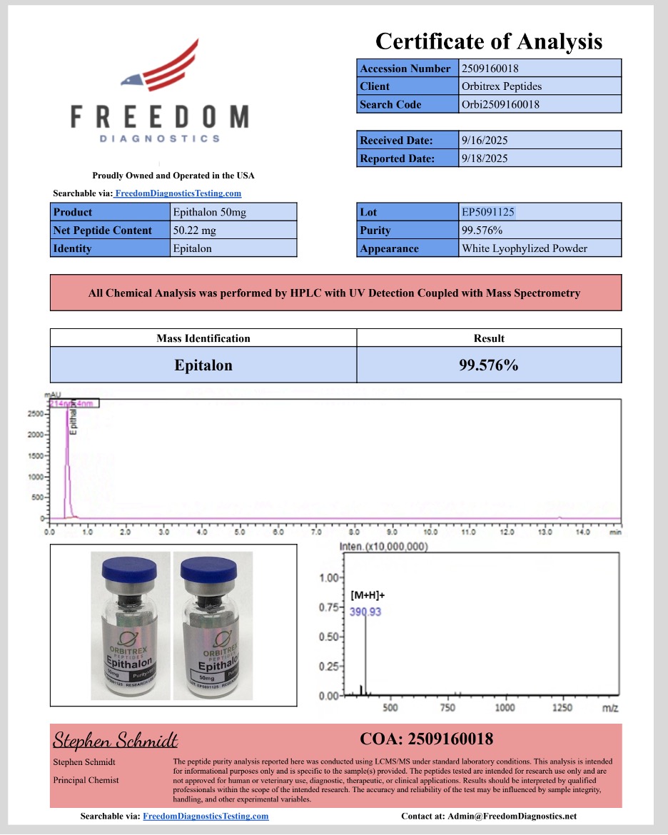 Every batch of Epithalon is verified with 3rd-Party Certificates of Analysis (COAs), confirming 99%+ purity for uncompromising accuracy in research applications. Supplied in lyophilized powder form, it is easy to handle and stable for long-term storage.