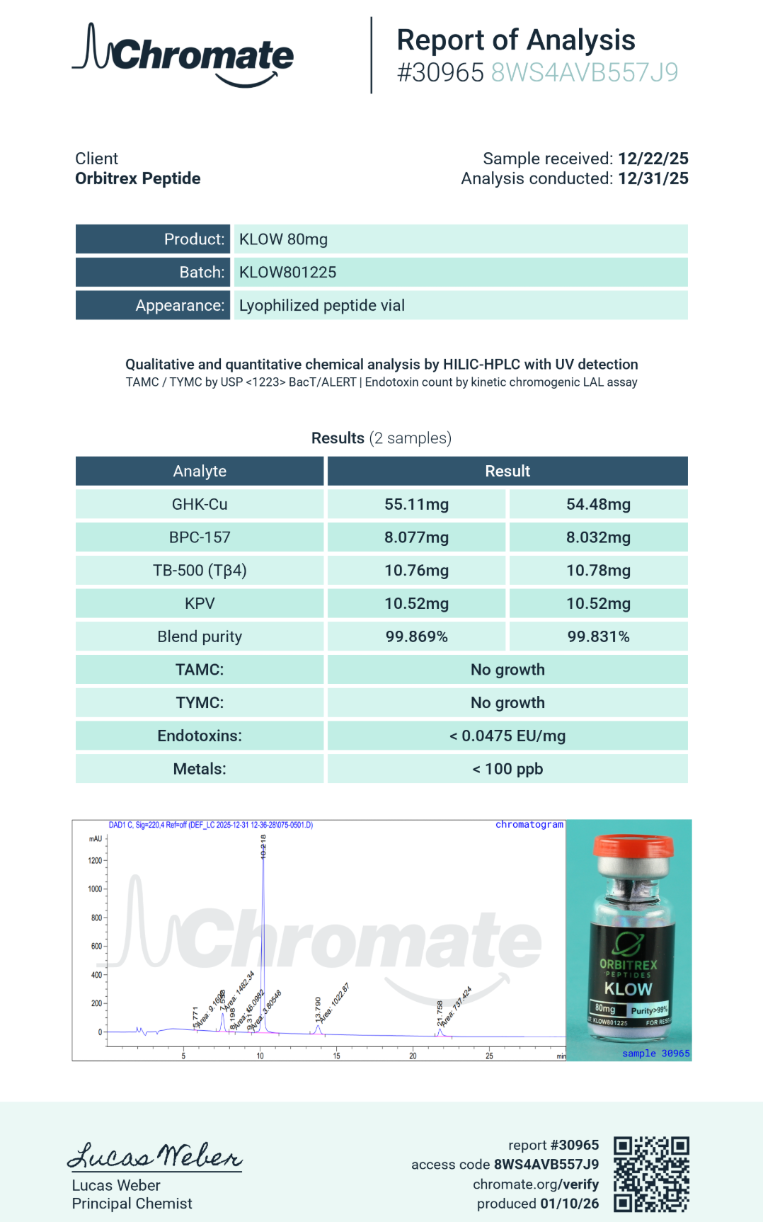 KLOW801225 54.795mg 10.77mg 8.06mg 10.52mg 99.85% <0.0475EU/mL <100ppb