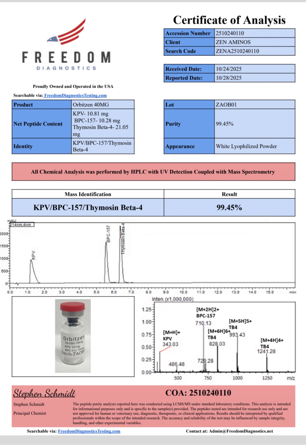 At Orbitrex Peptides, we are committed to setting new standards in quality, transparency, and reliability. Our Orbitzen 40 is designed to provide researchers with a peptide that ensures accuracy and reproducibility in every experiment. This product is an exclusive blend that has been formulated by the combined efforts of Zen Aminos and Orbitrex Peptides. The product contains a unique blend of 20mg TB-500, 10mg BPC-157 and 10mg of KPV. This unique blend will optimize the research through a more improved and focused combination of these three peptides known through research to bring rapid healing, recovery and inflammation control.